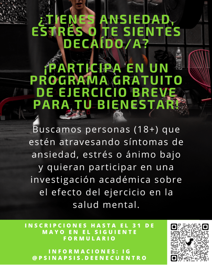 En junio del 2025 iniciamos un programa gratuito de ejercicio adaptado (HIIT-A) como parte de una investigación sobre salud mental comunitaria. Incluye acompañamiento profesional, evaluación y entrenamiento físico. Iniciativa en colaboración con la carrera de Entrenador Deportivo UNAB y Fundación Red Psinapsis.